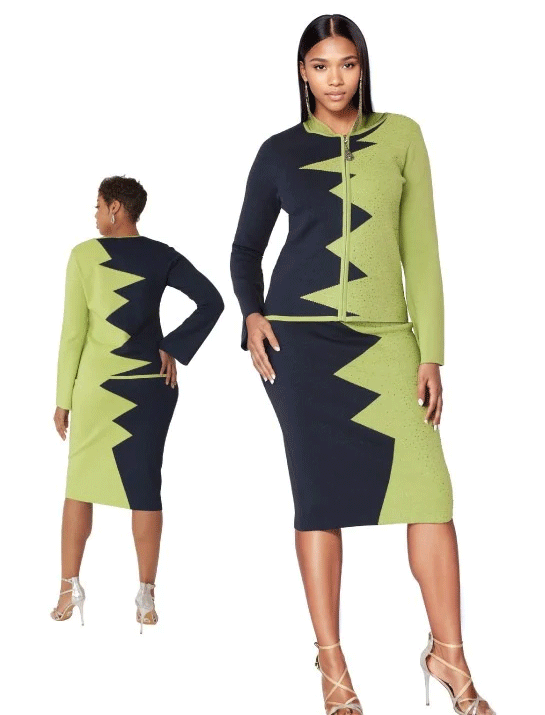 Elevate your formal wardrobe with the Kayla Knit Suit 5349C in Navy/Green. Featuring a secure zipper closure and adorned with subtle rhinestone accents, this suit combines elegance with comfort. Ideal for church services and weddings, its refined knit fabric ensures a polished look while allowing ease of movement throughout your special occasions.