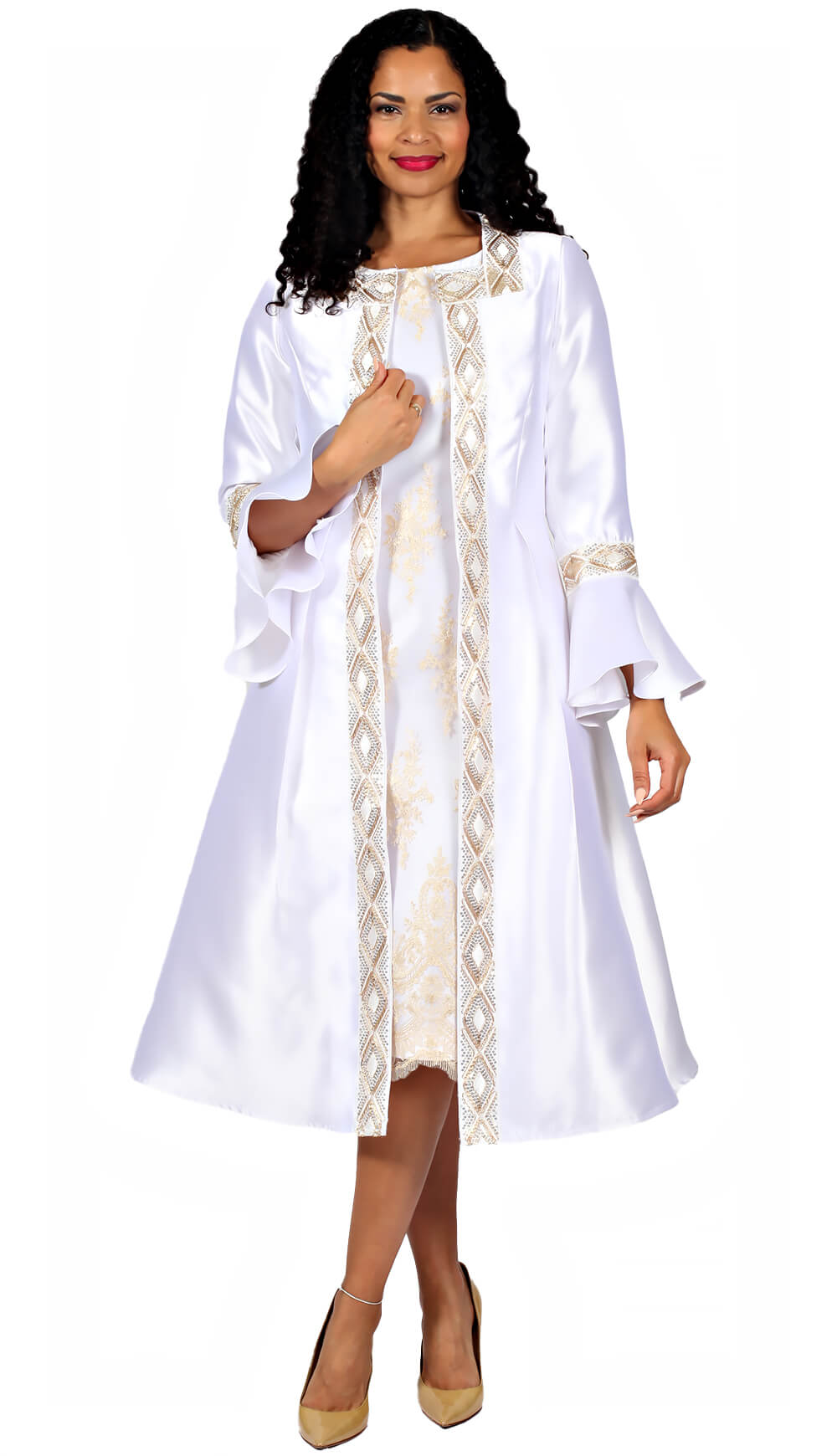 Introducing the elegant Diana Couture Church Dress 8791. This stunning jacket dress features a luxurious brocade overlay and a matching duster with delicately flared sleeves. The gold diamond pattern trim adds a touch of opulence. Available in white with gold, this dress comes in sizes 8-24, making it the perfect choice for any special occasion. Experience the perfect blend of style and sophistication with Diana Couture.