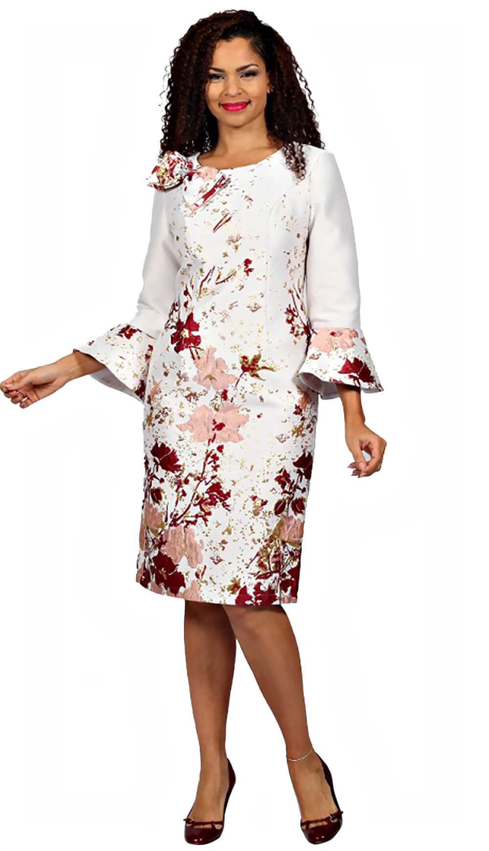 The Diana Couture Church Dress 8833 is the perfect dress for special occasions. Crafted from floral brocade fabric, it features a timeless shift style with flare cuffs and a bow trim. Available in sizes 8 through 24, you'll find the perfect fit for any formal event.