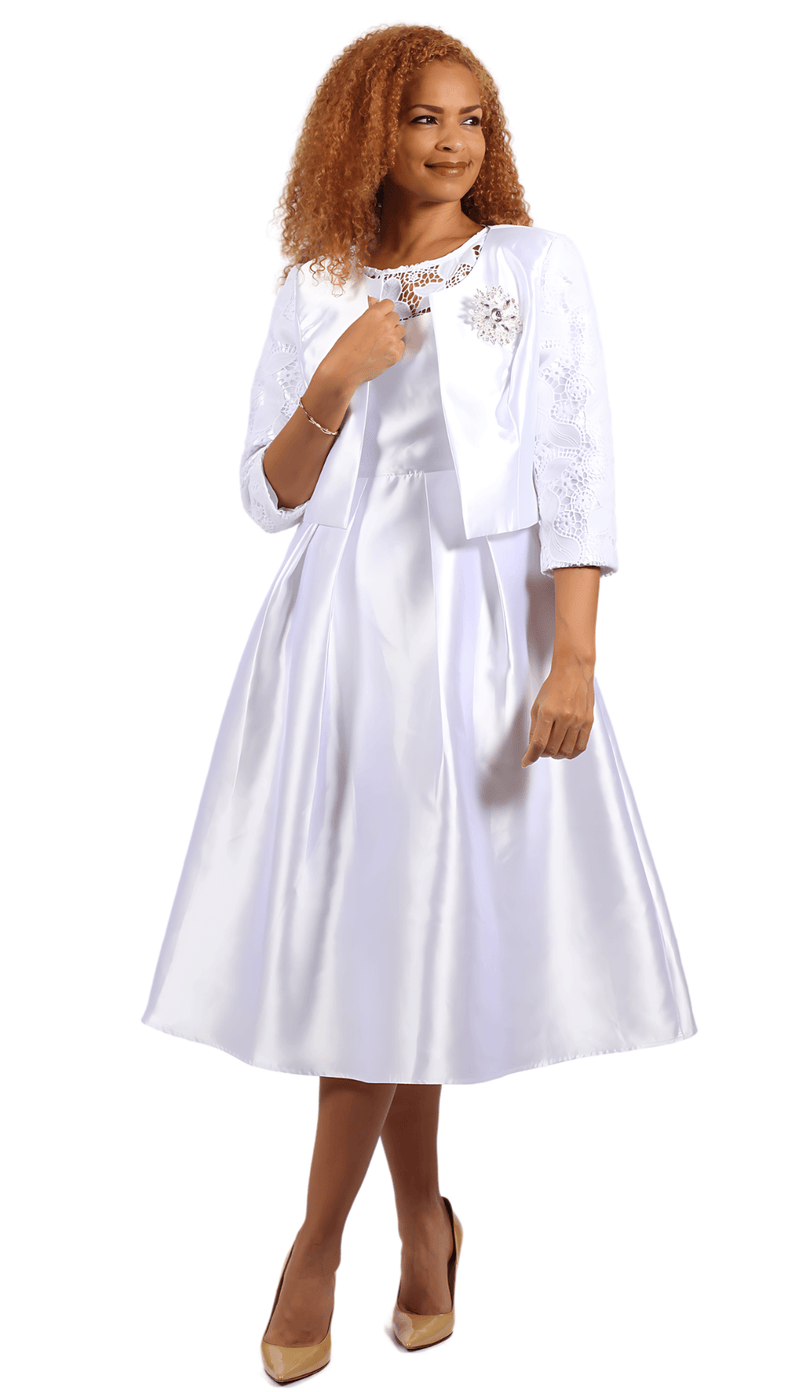 Experience luxury and elegance in the Diana Couture Church Dress 8966. Made of silky twill, this pleated midi dress boasts a delicate lace embroidery neckline and comes with a matching bolero for a timeless look. Adorned with a rhinestone brooch for a touch of sparkle. Available in white or black.