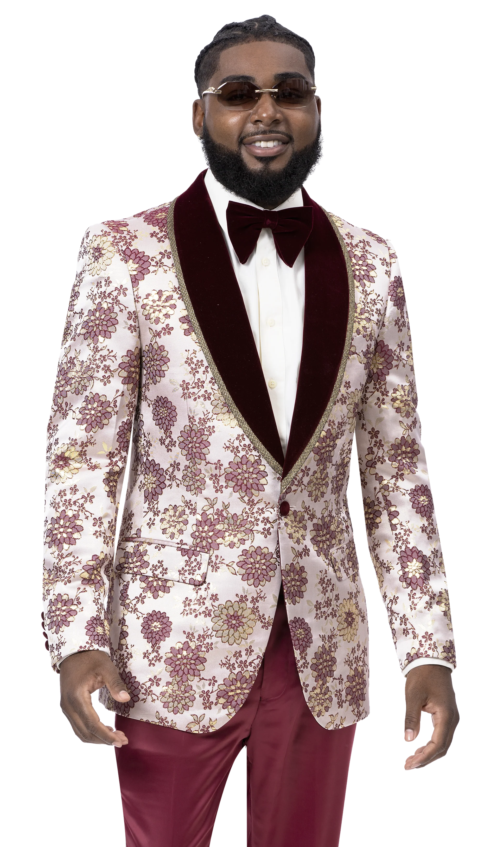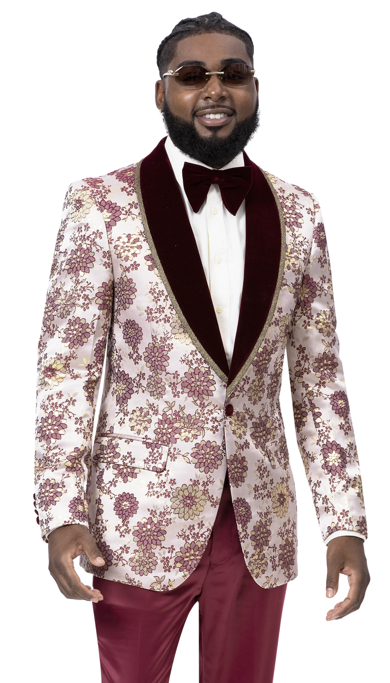 The EJ Samuel Blazer J171 is a standout menswear piece. Crafted with a 1-button closure, a gold satin trim burgundy velvet shawl lapel, and an ivory and burgundy paisley print for timeless elegance. Perfect for formal occasions or a special night out.
