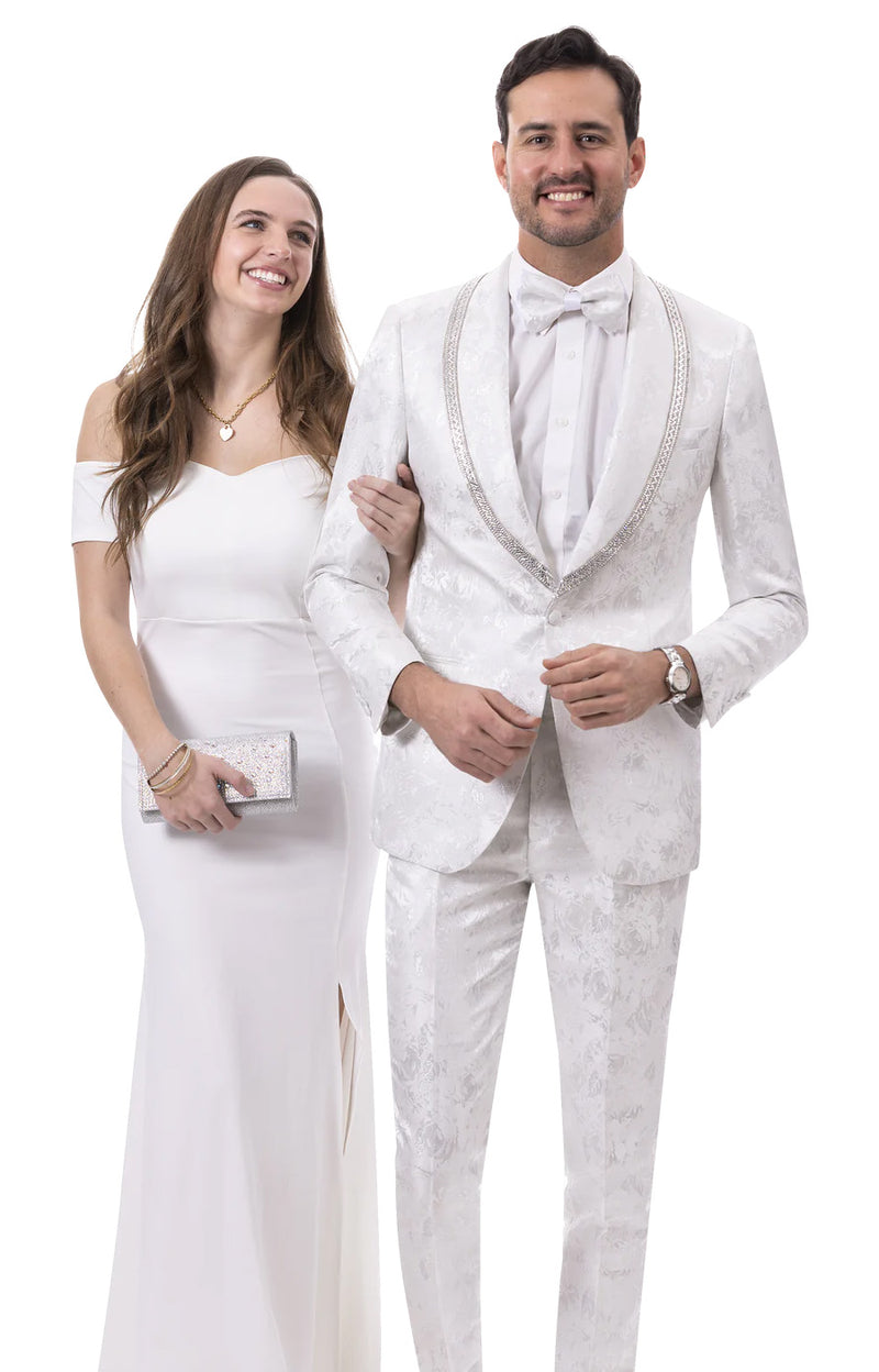 Elevate your formal wardrobe with this Slim Fit Fashion Suit from EJ Samuel.  the shawl lapel is trimmed with satin for added elegance. A gold frog closure and matching pants and bow-tie complete the look. Perfect for special occasions.