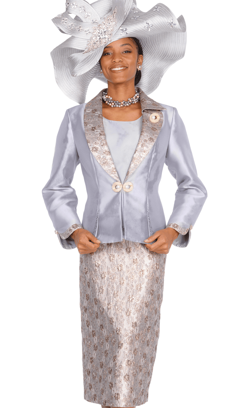 Expertly crafted with a three-piece floral brocade design, this Elite Champagne Church Suit exudes elegance. The notch collar and peplum add a touch of sophistication, while the cami and gold brooch complete the look. Available in silver, sizes 8-26. Elevate your style with this stunning suit.