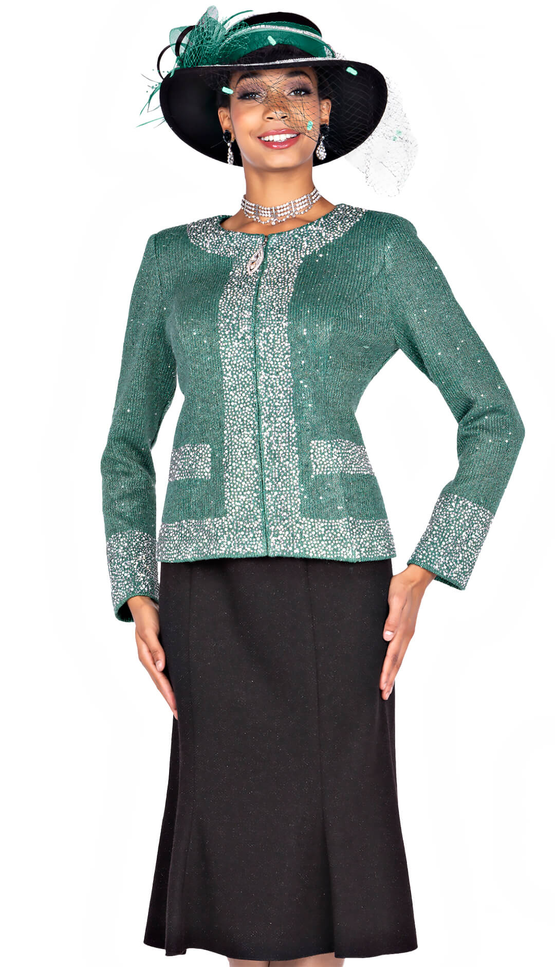 Made from quality fabrics, the Elite Champagne Church Suit 5961 presents a classy look with its red and black or green and black color combination, sequins, and rhinestone trim. Available in nine sizes, this knit flare skirt suit with a zip-front jacket ensures a figure-flattering fit.