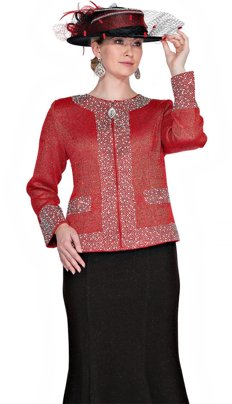 Made from quality fabrics, the Elite Champagne Church Suit 5961 presents a classy look with its red and black or green and black color combination, sequins, and rhinestone trim. Available in nine sizes, this knit flare skirt suit with a zip-front jacket ensures a figure-flattering fit.