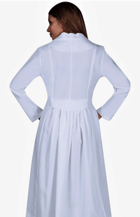 As an industry expert, the GMI Usher Dress-11573-White combines style and functionality. Made of poly crepe, this unlined dress offers hidden pockets, a button-front closure, a wing collar, and a pleated back. Its elegant design and easy maintenance make it perfect for church and choir groups