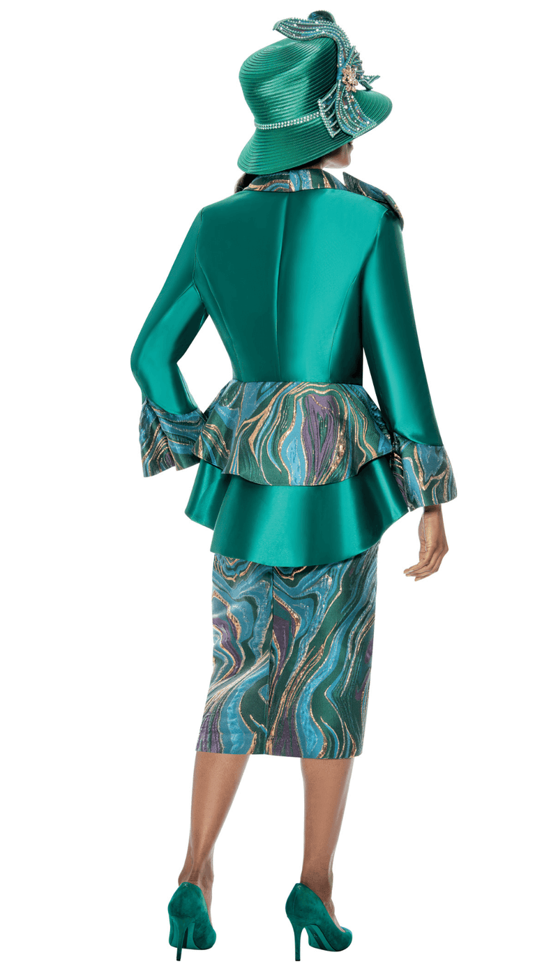 Upgrade your church attire with the GMI Church Suit 400812-Emerald. This elegant suit features a stylish cape sleeve jacket, adorned with rhinestone buttons and a beautiful brocade pattern skirt. The emerald color adds a touch of sophistication, perfect for any church service. Elevate your style and make a statement with this stunning suit.