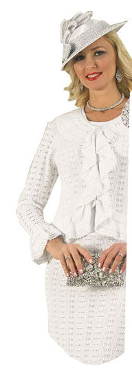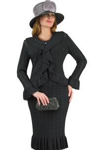 The Lily And Taylor Suit 824 offers a sophisticated 3pc Knit Church Skirt Suit with a stunning ruffle top and intricate crochet detailing. Perfect for a Sunday service or formal event, this fully lined suit features delicate ruffles along the skirt trim, sleeve cuffs, and lapel. Elevate your Sunday attire with this elegant and timeless choice.