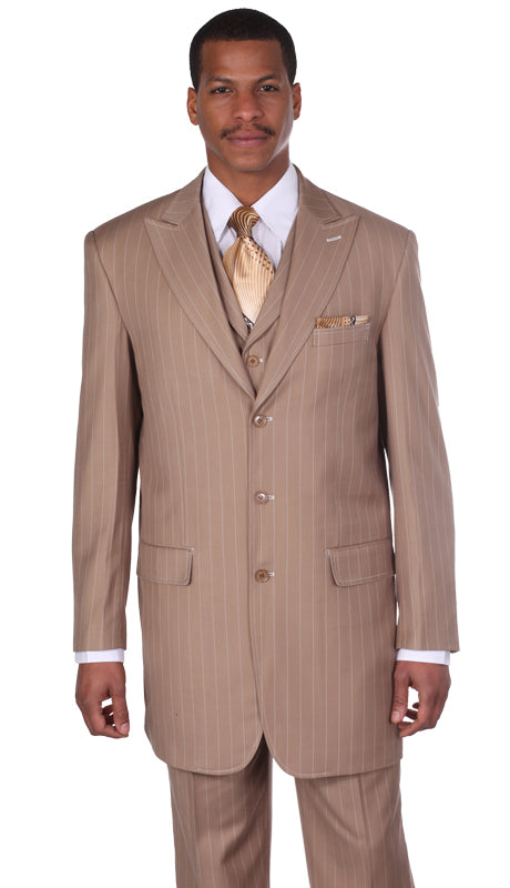 This 3 piece single breasted 3 button jacket includes peak lapel, besom pocket, flap pockets, and side vents.it comes with single breasted 4 button vest.