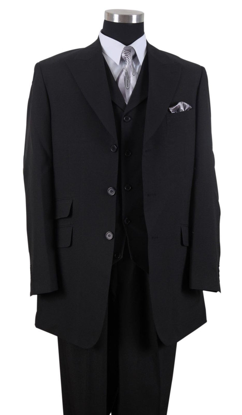 Single breasted men suit, three button jacket with ticket pocket 100% poly poplin, double side-vents jacket, 4 buttons collared vest, pleated front pants, unfinished bottoms for easy alteration.