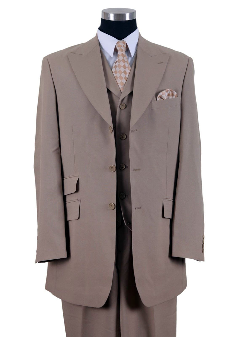 Single breasted men suit, three button jacket with ticket pocket 100% poly poplin, double side-vents jacket, 4 buttons collared vest, pleated front pants, unfinished bottoms for easy alteration.
