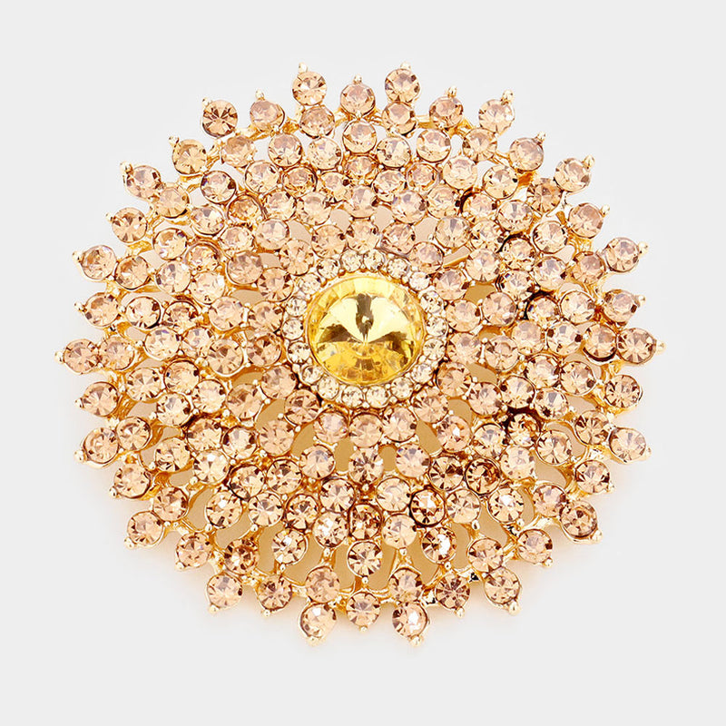 • Women Stunning Sparkling brooch in a layered concave design. large clear rhinestone brooch. Brooch measures approx. 2 inches in diameter