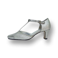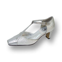 Women's extra wide width open shank pump complements well with any formal or fancy affairs. This ladies medium heel shoe with its T-strap design, PU toe cap and glitter fabric body is aesthetically appealing to the eye and just simply fun to wear.