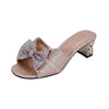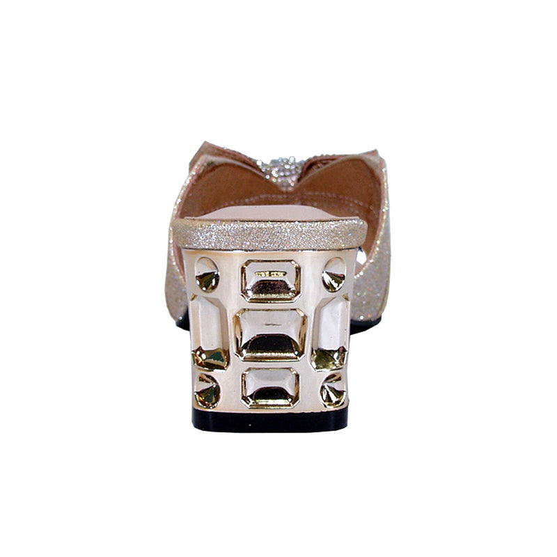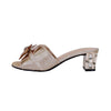 Women wide width open-toe slide sandal is dazzling with an amazing glistening rhinestone bow. This ladies 2" block heel is especially unique with its sculpted ornate look. This special sandal features a metallic upper along with an extra cushioned insole. Its out sole is made of durable and lightweight rubber materials for maximum surface grip to give you support so you are party-ready.